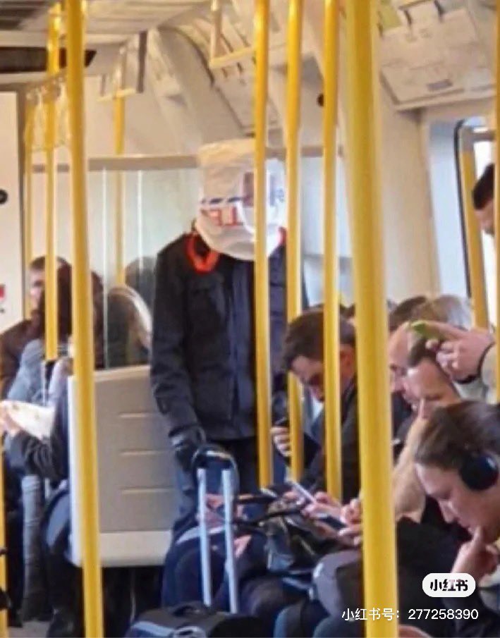 Meanwhile in the UK people are using Tesco bags over their heads to protect from COVID-19 as they ride the tube.pic.twitter.com/82oyqwAad2