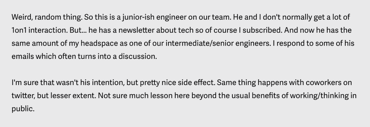 From founder friend of mine Does feel like most underweight the benefits of having more public surface area. Even if just for internal to company purposes Similarly people underweight how much communication within company they should be doing about what their team is working onpic.twitter.com/1zRxyyjR5I