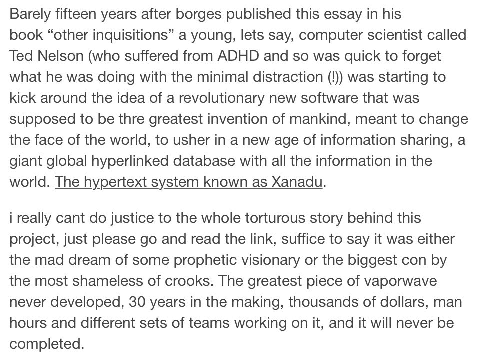The main takeaway here is to never name a software project Xanadu https://aaronsmithtumbler.tumblr.com/post/627721776647045120/the-dream-of-xanadu …pic.twitter.com/8EyGA2GMPo