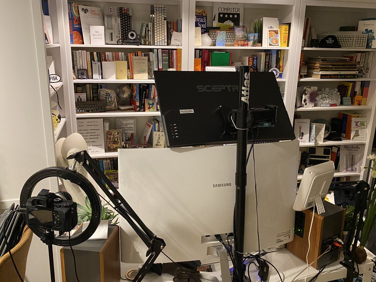 two soft boxes behind where I’m standing, ring light reduces glasses blur and does soft yellow lighting, the over is just a UV lamp because Boston is dark af in the winter