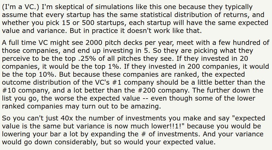 Interesting discussion on VC fund diversification over at Hacker News: "For reliable excess returns, VC funds need 500 investments" https://news.ycombinator.com/item?id=24657919 … I disagreed with the premise and posted some thoughts:pic.twitter.com/xkVFleQEY9