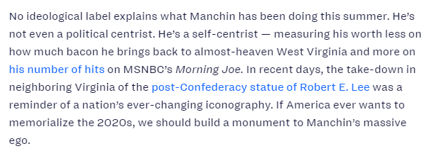 No ideological label explains what Manchin has been doing this summer. He’s not even a political centrist. He’s a self-centrist — measuring his worth less on how much bacon he brings back to almost-heaven West Virginia and more on his number of hits on MSNBC’s “Morning Joe”.https://twitter.com/Will_Bunch/status/1438565480047030272 …