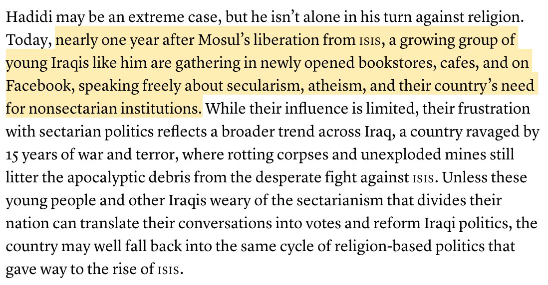 Life after ISIS in Iraq: the rise of secularism, among the young, who reject political Islam. Great reporting by