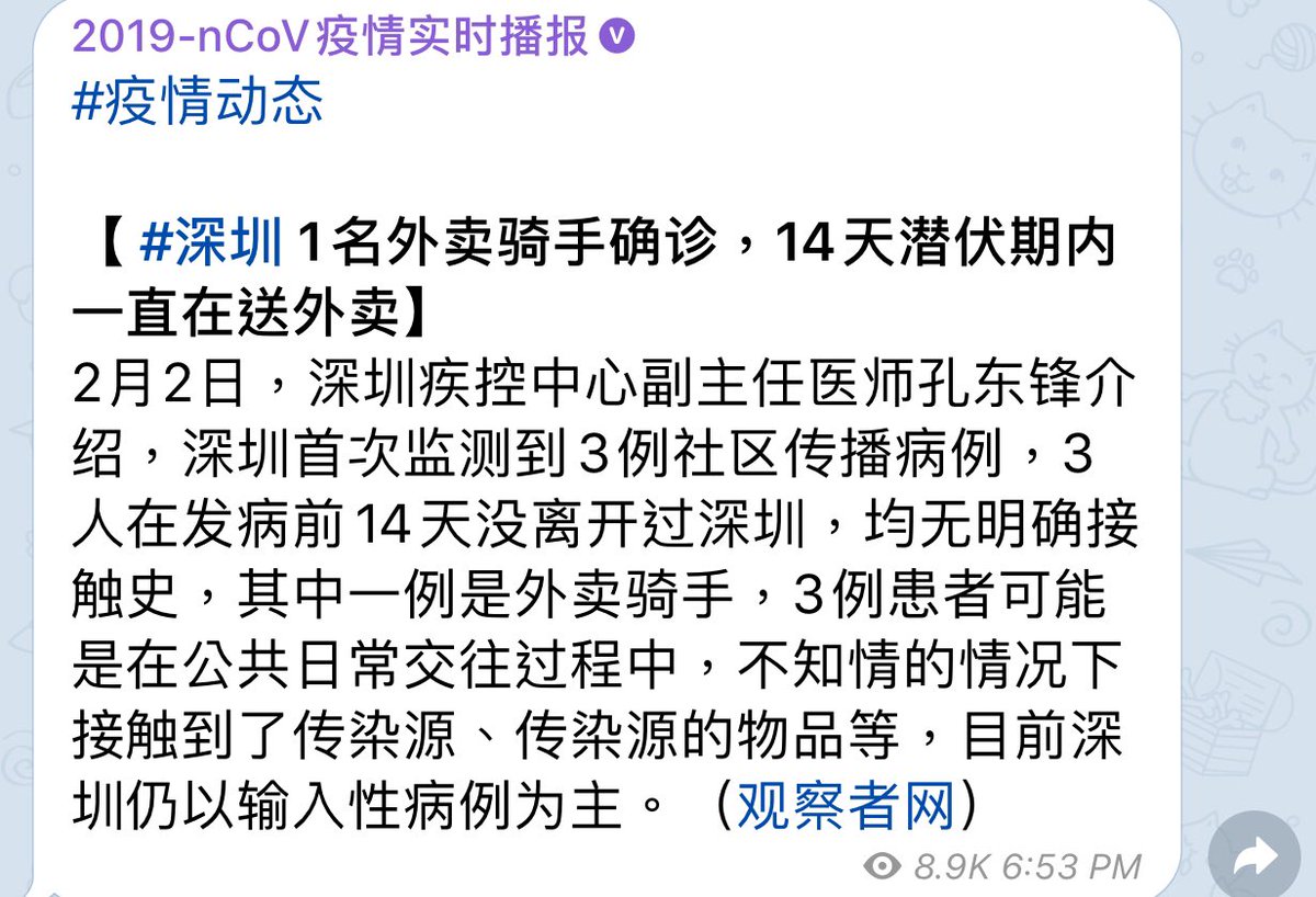 #Shenzhen, the city has caught three cases of community transmission. All the patients didn’t leave Shenzhen 14 days prior to showing symptoms. One of the patient is a delivery worker, who had been delivering food across the city during the incubation period.pic.twitter.com/o35SiOR7nf