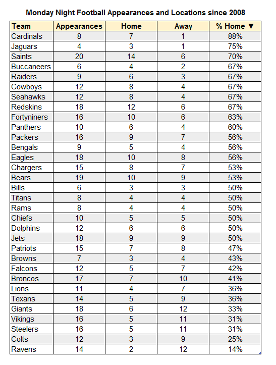 Not sure how this is possible but... since 2008 the Ravens have played on Monday Night Football 14 times. TWO home games vs 12 road?!! Least fair of any team. Home : Away on MNF since 2008 Best: ARI 7 : 1 NO 14 : 6 DAL & SEA 8: 4 Worst: BAL 2 : 12 IND 3 : 9 PIT & MIN 5 : 11