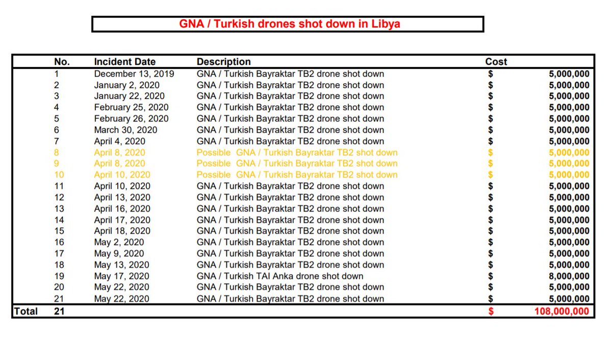 #LNA managed to shot down 20 #GNA / #Turkish #Bayraktar TB2 with estimated cost of 100,000,000 USD in 6 months. #LNA managed o shot down 1 GNA / Turkish #TAI #Anka with estimated cost of 8,000,000 USD. 3/6pic.twitter.com/7SD0yFg66L