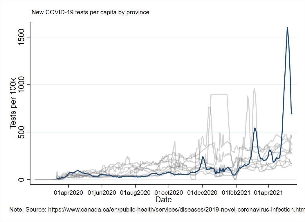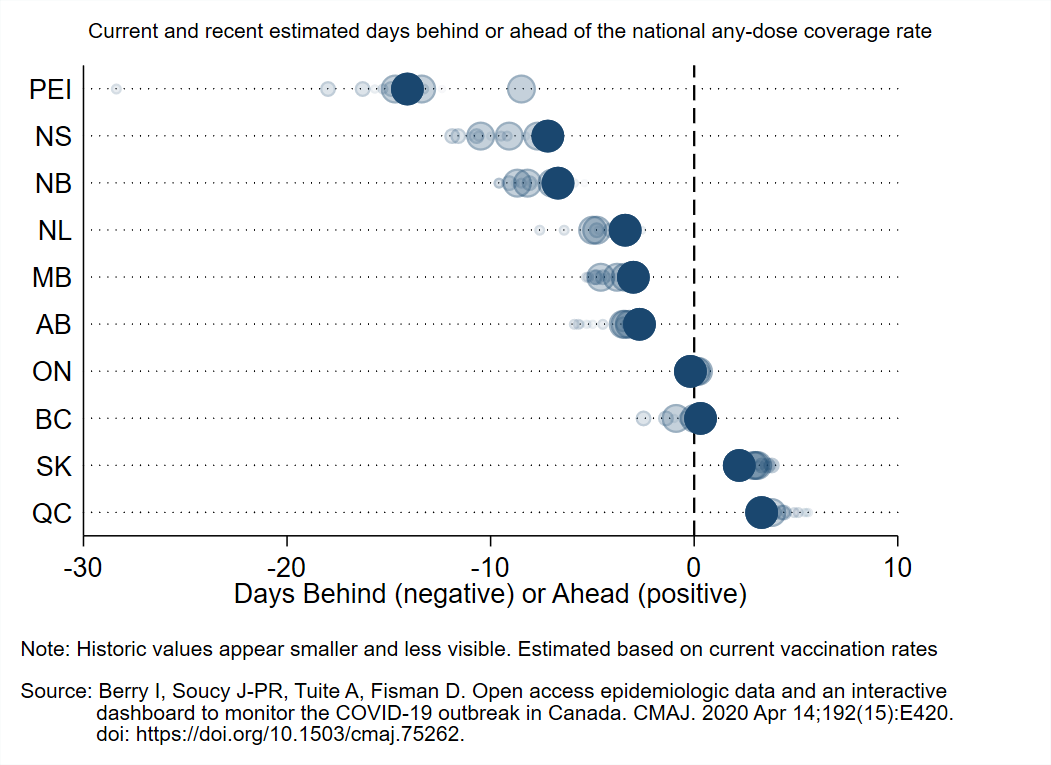 This animation shows each province's vaccination pace as a percent of the pace they need to each 80% first dose coverage by the end of June (based on how many they have already vaccinated and how much time is left). Older data becomes less visible over time.pic.twitter.com/xBQK8nCLlG