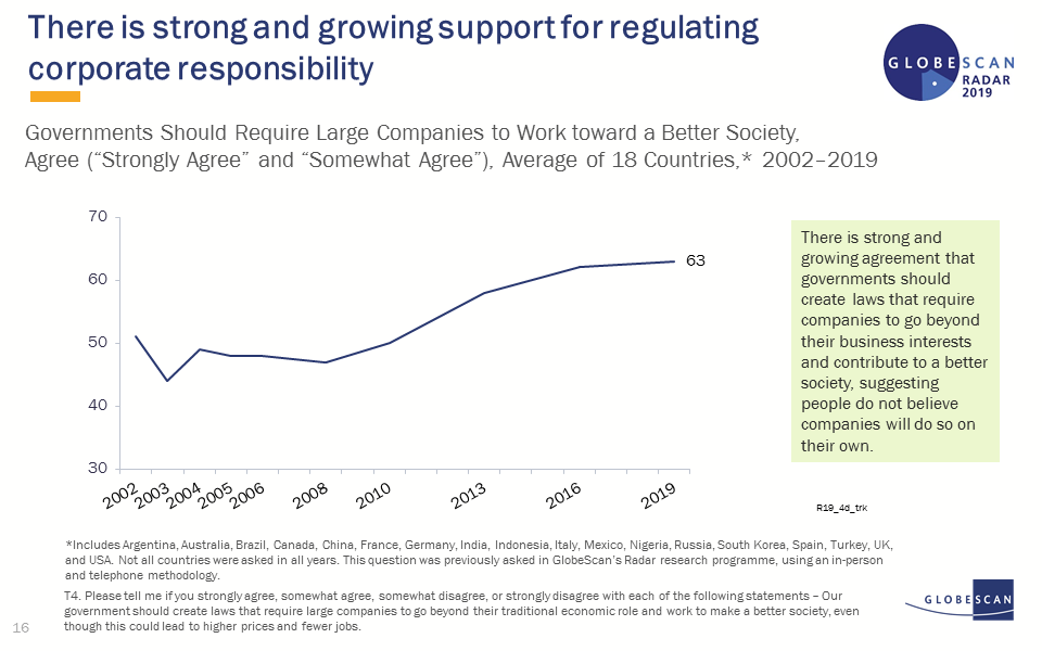 There is strong and growing agreement that governments should create laws that require companies to go beyond their business interests and contribute to a better society, suggesting people do not believe companies will do so on their own. http://bit.ly/38LyfD5 pic.twitter.com/UuBUrpox4a