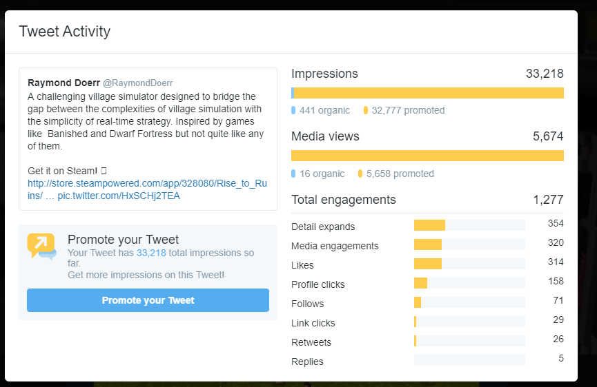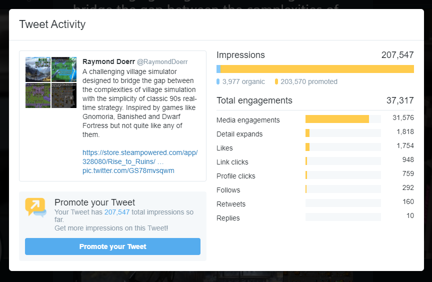 Fellow #indiedev curious if Twitter Ads are worth it; I ran a twitter promotion experiment yesterday, spending $100 one day, and $500 a few days later, these were the results. These were thew two tweets promoted: https://twitter.com/RaymondDoerr/status/1044769087140716544 … https://twitter.com/RaymondDoerr/status/1050417613250035713 …pic.twitter.com/p2ABdiS3YP