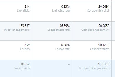 Here's the actual metrics, appears CPC on the "website clicks" campaign was about 65 cents a click. **But** the other 3 campaigns geared for followers, engagements or just general impressions may have also resulted in clicks too. No way to know for sure.pic.twitter.com/kku2KRpHfc