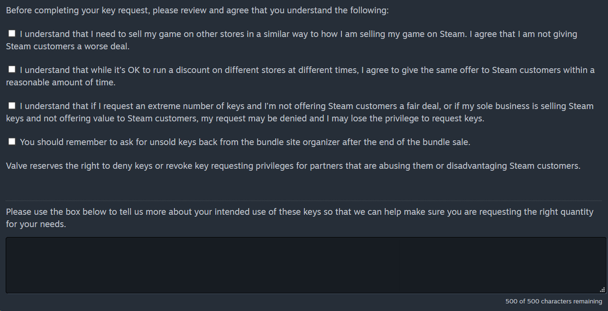 This is new. When did this go in? Now the Steam request-keys form moralizes at you and makes you check some very, uh, checkboxes.pic.twitter.com/WkpmZ3AfYG