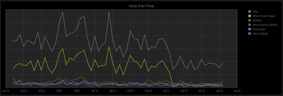 This is interesting, this shows the green "other product pages" line (which I believe is links between similar games?) flatlining like has happened to many afflicted games. But this apparently started THIS MONTH. I... I have no explanation for this.https://twitter.com/SuperSixStudios/status/1108943172464312320 …