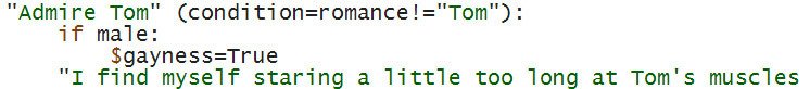 In my other RPGs with straight/gay romances, a complaint from users was “unwanted gay scenes.” In #PlanetStronghold2 I’m setting a flag based on player’s choice: then the game will show according scenes in future. Hopefully this will make everyone happy! #indiedevpic.twitter.com/avCWG39SZM