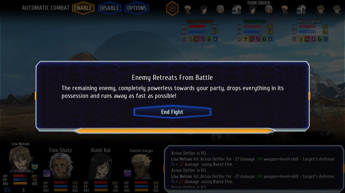 I've re-enabled the "last enemy remaining flees from battle", since players found a way to exploit the Defend HP regen to always end a battle with characters to almost full health :D #PlanetStronghold2pic.twitter.com/VCAWkUFE3b
