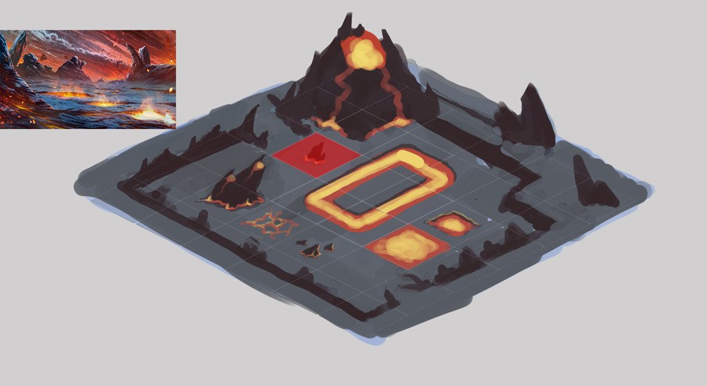 I needed a new tileset with a volcano, lava, etc and artist sent this mockup, it’s just a sketch but I like it already. Will be able to design the tilemap already this way #PlanetStronghold2 #indiedevpic.twitter.com/BNzz9Ke367