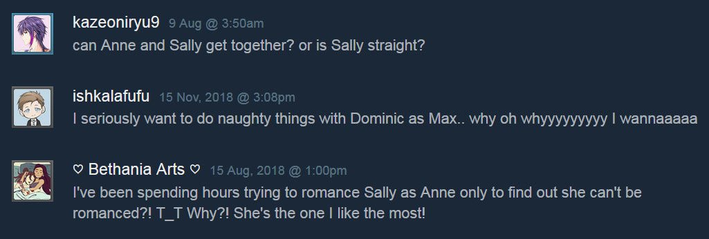 the comments on #Roommates Steam guide are a good example of what us dating sim devs should expect: complaints about every single romance combo not implemented in the game :D #datingsimpic.twitter.com/jplHNptpWy