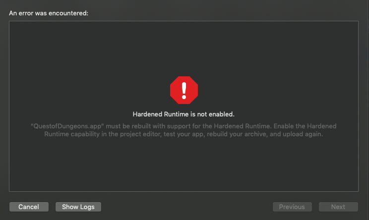*Reads that Mac notorizing doesn't require rebuilding -It actually does cause "Hardened Runtime" (or if you don't have 64bit build)pic.twitter.com/hblQ9GKR2F