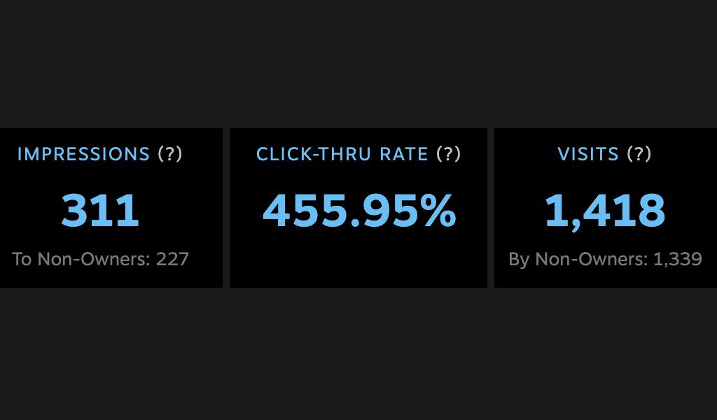 If anyone's interested in organic Steam traffic for a "coming soon" page, here's Bonfire's data from day 1. The entire Steam platform has shown the game to 311 people (of which 227 weren't me). The rest is folks I brought in myself.pic.twitter.com/VzFCiDb9xl