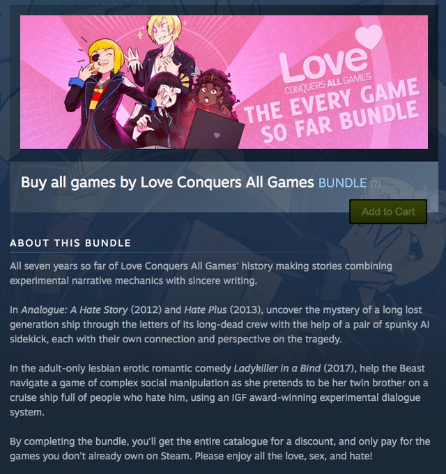 Every single one of my games on Steam is currently on sale for 50% off right now! PLUS, if you already own some, you can get an even bigger discount by finishing the set in “THE EVERY GAME SO FAR” bundle!!! https://store.steampowered.com/bundle/8598/all_games_by_Love_Conquers_All_Games/ …pic.twitter.com/E9I8l5HuZQ