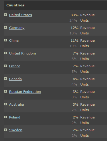 Now that Yes, Your Grace has been out for a week, I thought it might be interesting to look at the top 10 countries ranked by revenue Those German, Chinese, French and Russian translations definitely paid off! English-speaking countries have accounted for ~50% of revenuepic.twitter.com/zG70YjP8m5