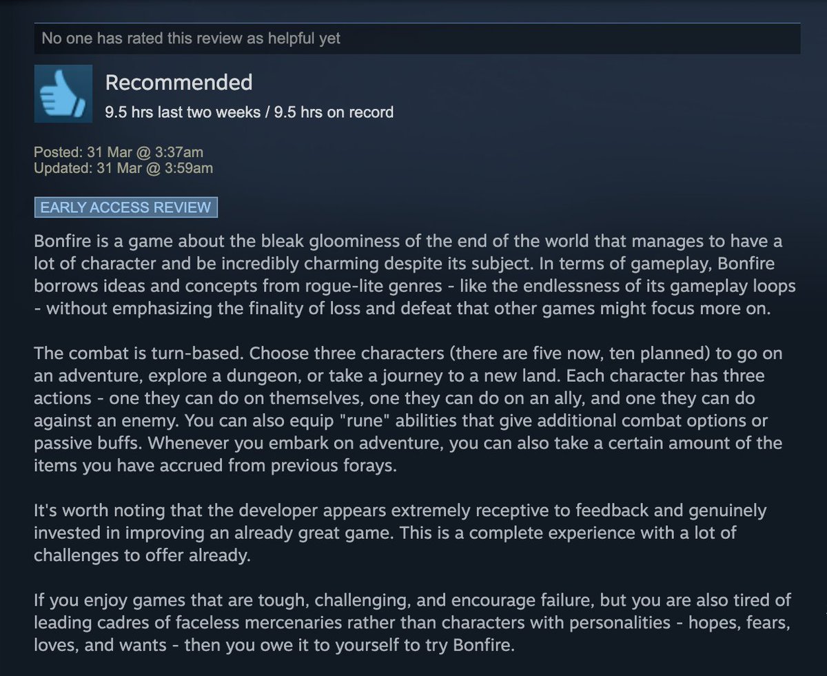Bonfire has the lowest purchases-to-review ratio of all my games (like seriously, WTH?!), but then you get something like this and all is fine in the world.