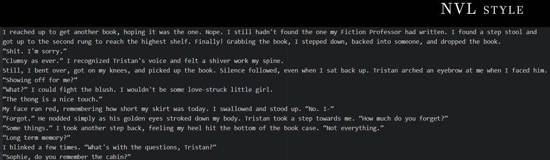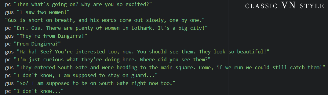 on the left, classic VN style. Dialogues, then description. NVL instead is more like reading a book, with dialogues mixed in the events/scene description. Many RPGs used it, like Pillars of Eternity, etc but is uncommon in VN (AFAIK!)pic.twitter.com/lIPDt8nIzw