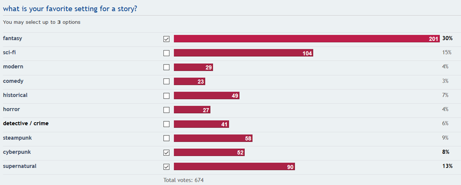 I was checking my "preferred story setting" poll. Supernatural is rather high, but both horror and detective are low. Does it mean supernatural=stuff like Twilight? urban fantasy I think is called? so supernatural+horror for example not good?pic.twitter.com/SJopqF31kv
