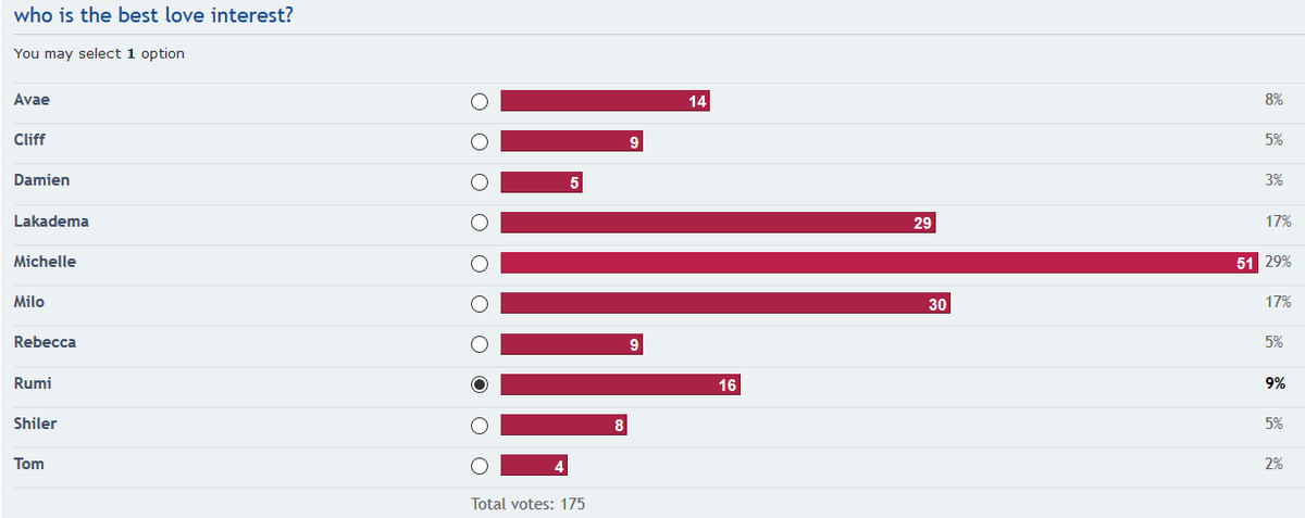several months later, Michelle is still best PS2 romance by far. Second Milo and third Lakadema (furry power? :P) Surprised by the low score of Cliff compared to how many positive posts I got about him in forums/Steam!pic.twitter.com/oSNcBLvVn8