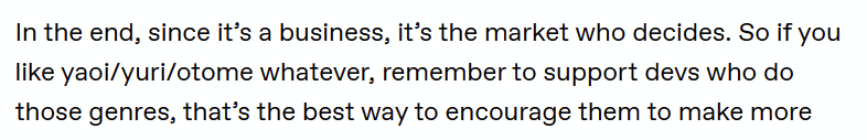 from my latest blog post. Giving feedback and support to devs is great, and I really appreciate any nice email/comment I get, however since in the end is a business, our decisions are made based on how well something sell (ex. yuri games).pic.twitter.com/C2waIwnoLY