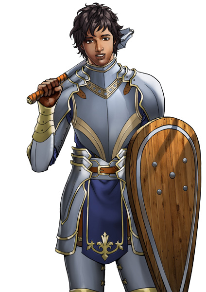 Have you found a solution yet? Honestly, the shield is less of an issue than the mace as it gives less of a "combat ready" feel. This has a harder shading style to imitate for me than the CGs of Mantras, but if you want I can also try and check this one out to edit the pose