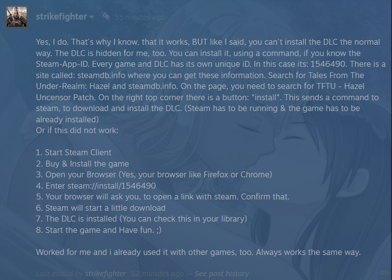 an user posted an interesting "trick" for those poor German fellow having issues getting adult content (or in this case free adult DLC uncensor patch): https://steamcommunity.com/app/1394550/discussions/0/3112522283881340642/?tscn=1615279566 …pic.twitter.com/4BdmvRdIgF