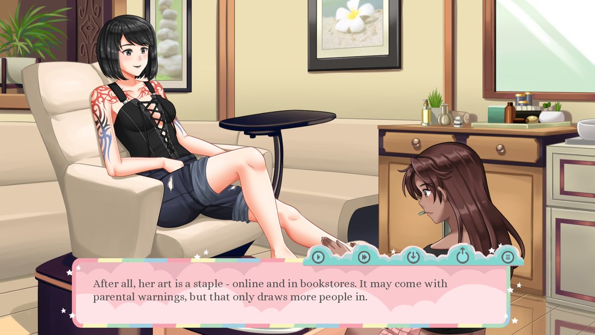in the game story, Lucy is an adult comic artist, DJ, and fervent feminist. She's one of my favorite characters for her personality! Wishlist it here: https://store.steampowered.com/app/1537800/At_Your_Feet/ …pic.twitter.com/SZtv6MXQfG