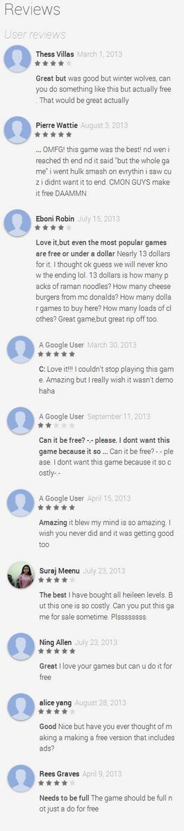A small sample of typical Android comments for a paid game. Tempted to make it "free" with $99 IAP purchases XDpic.twitter.com/g3EcPORrpF