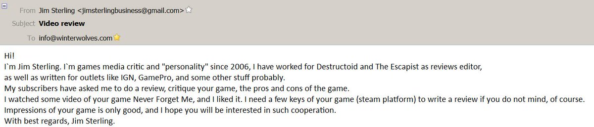 1) a super popular youtuber wants to cover your small indie game? YEAH SURE :D 2) they would NEVER ask "several keys"