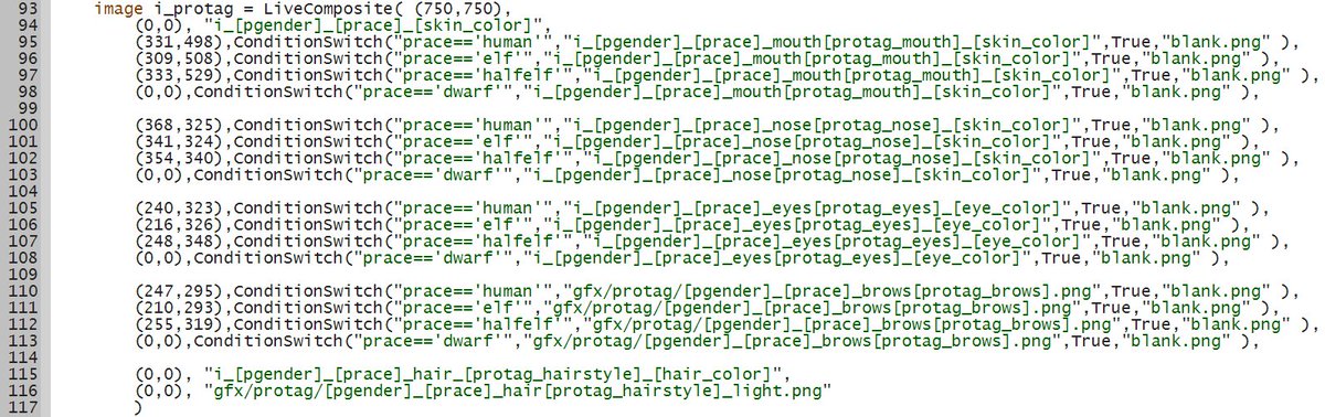 this character creation is probably the most complex image coding I've ever done in Ren'Py. Still less than 25 lines long! Python power