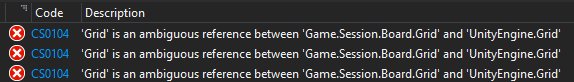 So I have a lovely Grid class in the game which gets used all over the place. Upgraded to Unity 2017.2, they added a Grid class as well for their own purposes, but at top level in UnityEngine, not in a namespace. Name conflicts *everywhere*. 😠pic.twitter.com/ALEVvNS9y7