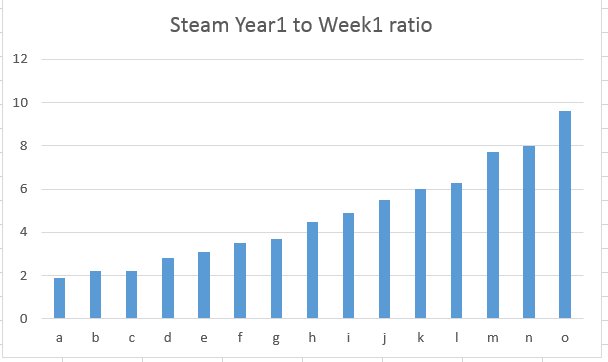 I made a chart of Steam gross revenue year1 vs week1 ratio using data from my games and from several friends. Send me yours publicly or privately if you like. Note the average is 4.8x. Some games blip at launch and don't do so well long term, others have a fatter/spiky tail.pic.twitter.com/xWyJVM7ZaI