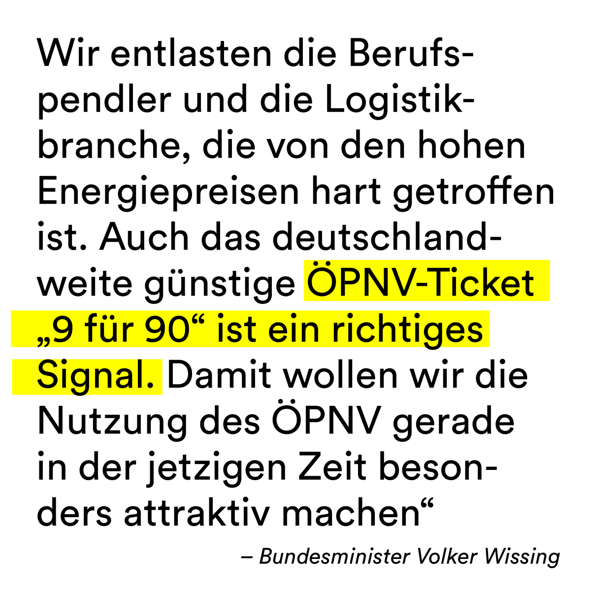"Das deutschlandweite günstige ÖPNV-Ticket „9 für 90“ ist ein richtiges Signal. Die Ticketpreise werden wir den Ländern erstatten. Details werde ich morgen mit den Ländern im Rahmen der Sonder-VMK besprechen", BM