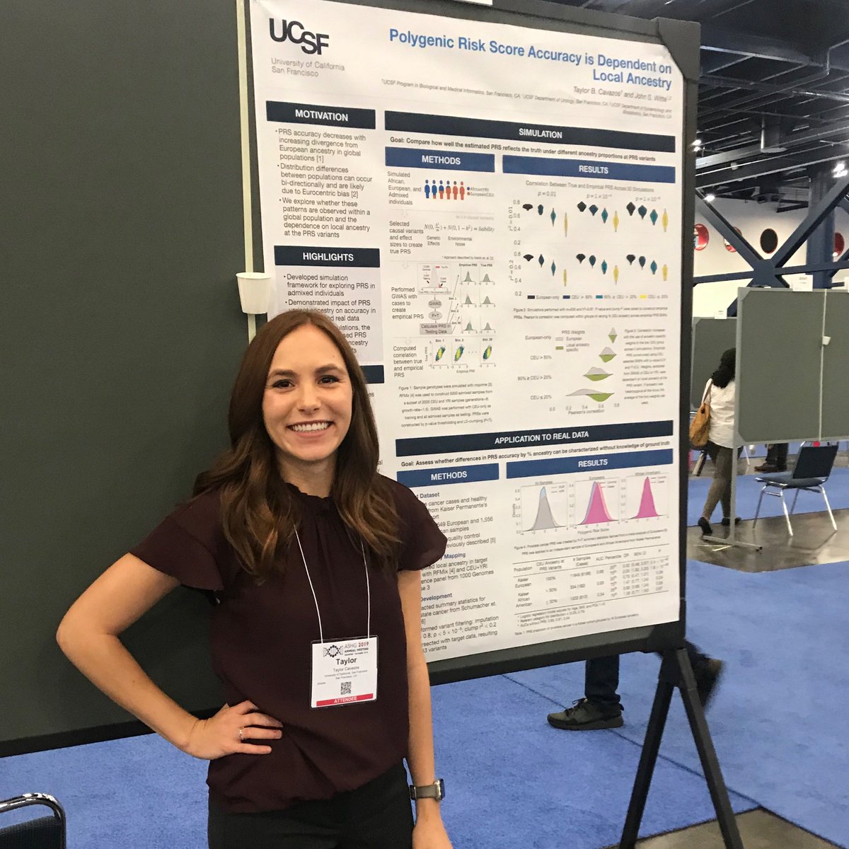 @WitteLab PhD student, Taylor Cavazos at her poster (#2259) today from 2-3pm to discuss polygenic risk score performance in admixed individuals!@UCSFGradDiv@ucsfipqb#ASHG19#ASHGtraineepic.twitter.com/8QLM9JaQOn
