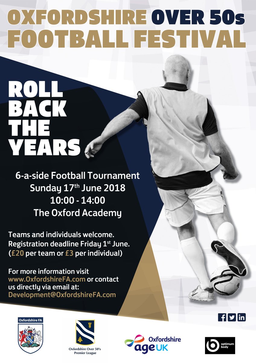 #RollBackTheYears ... Make your return to football or try it just for fun with our dedicated Football Festival in partnership with@OxOver50Premier &@AgeUKOxon http://bit.ly/Over50sFestival pic.twitter.com/ZxFErBHLlp