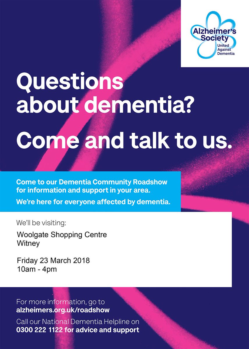 @alzheimerssoc Dementia Community Roadshow will be in Witney tomorrow (Friday 23 March). Find them at Woolgate Shopping Centre from 10am-4pm. For more information see: http://socsi.in/kz3iT@Woolgatescpic.twitter.com/YTPW1SSDEO