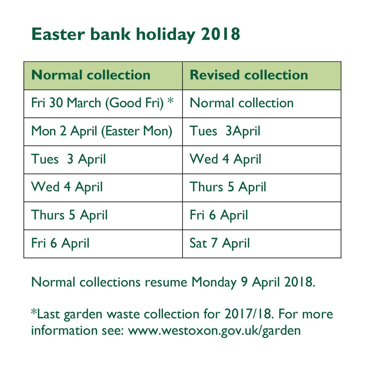 Pls note bin collections will be 1 day later next week + our offices are closed on Good Fri + Easter Mon so any social media queries will be answered on Tuesday. For urgent issues ie dangerous structures, pls call 01993 861000.pic.twitter.com/5zubNjlkC5