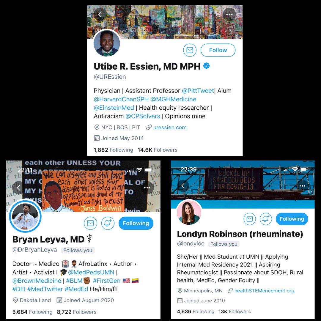 #MedTwitter that everyone should follow!@LashNolen@choo_ek@gradydoctor@UREssien@DrBryanLeyva@londyloo@oni_blackstock@uche_blackstock@QaaliHussein1@ChaseTMAnderson@DrBrittaniJ Comment below with any others we missed!!pic.twitter.com/QY8c1ZMSMx