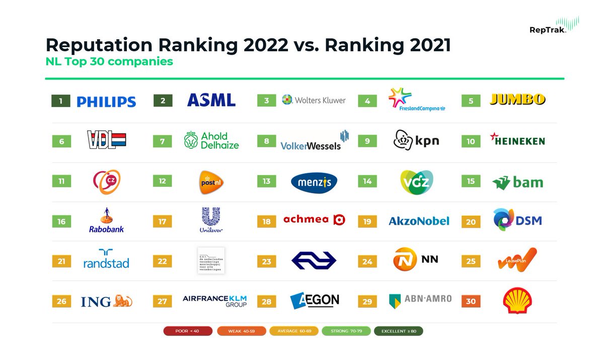 @RepTrak Netherlands, the annual reputation survey among the Top 30 Dutch companies, is out! We are very proud to take up the 3rd place, up six places from last year! Read more here: https://www.wolterskluwer.com/en/news/wolters-kluwer-included-in-top-3-of-dutch-companies-for-best-reputation …pic.twitter.com/zDX7loQ86z