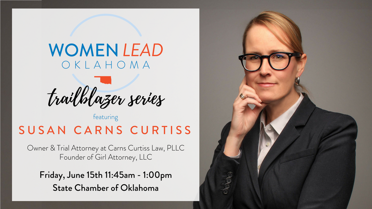 Join us this Friday for a conversation with Oklahoma #Trailblazer and founder of @TheGIRLATTORNEY, Susan Carns Curtiss! Get your tickets here: https://tinyurl.com/ycbhs9hl  #WomenLeadOKpic.twitter.com/zTT0ftwr3B