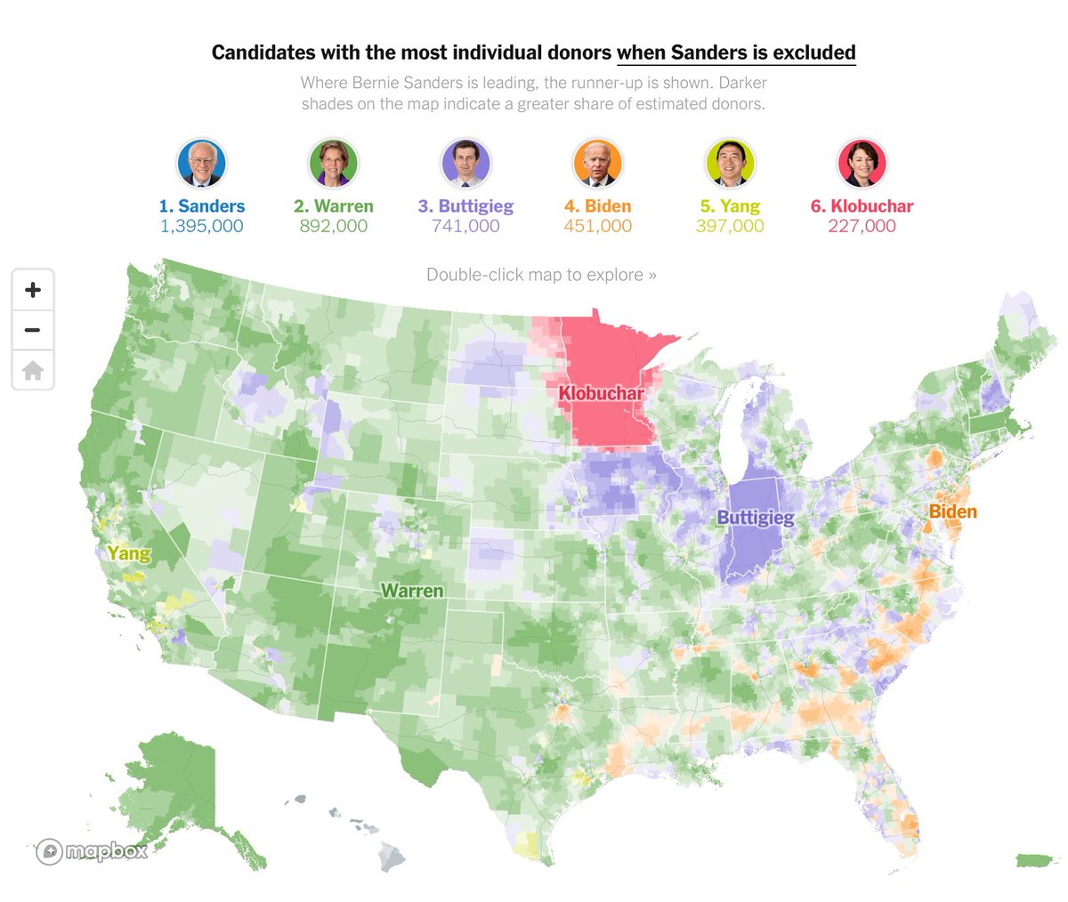 Maps have more significance when you realize most common Bernie donors are low-income teachers & students and Warren’s are high-income professors & psychologists. Easy to donate when you’re making a nice living, harder when you’re not!