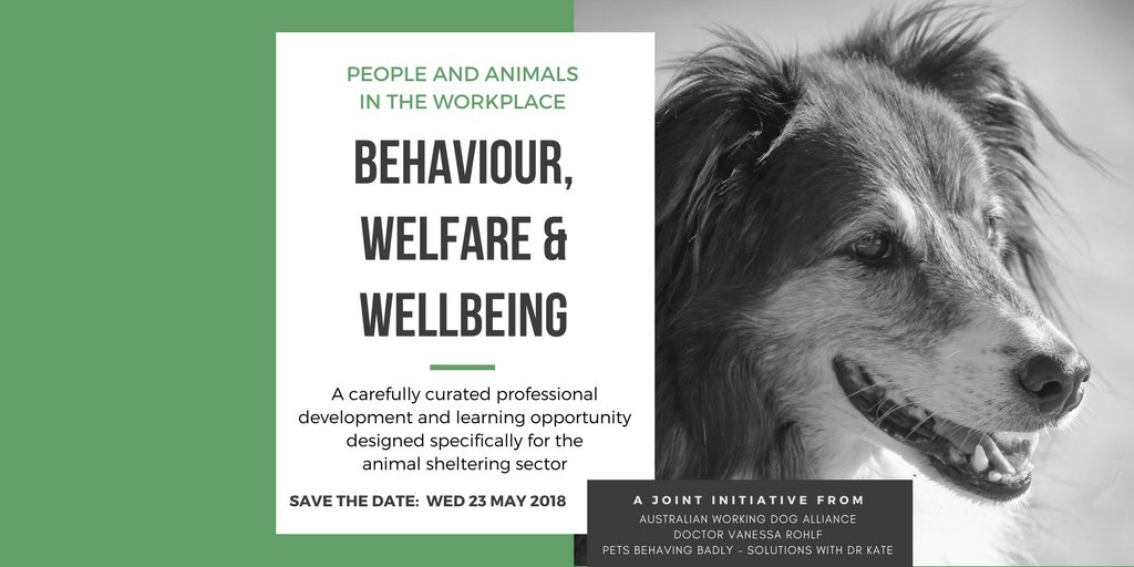 Our first People and Animals in the Workplace event is coming! BEHAVIOUR, WELFARE & WELLBEING SEMINAR for people working in animal shelters: May 23. Full program coming soon. Register your interest to attend here: http://bit.ly/PAWMay2018