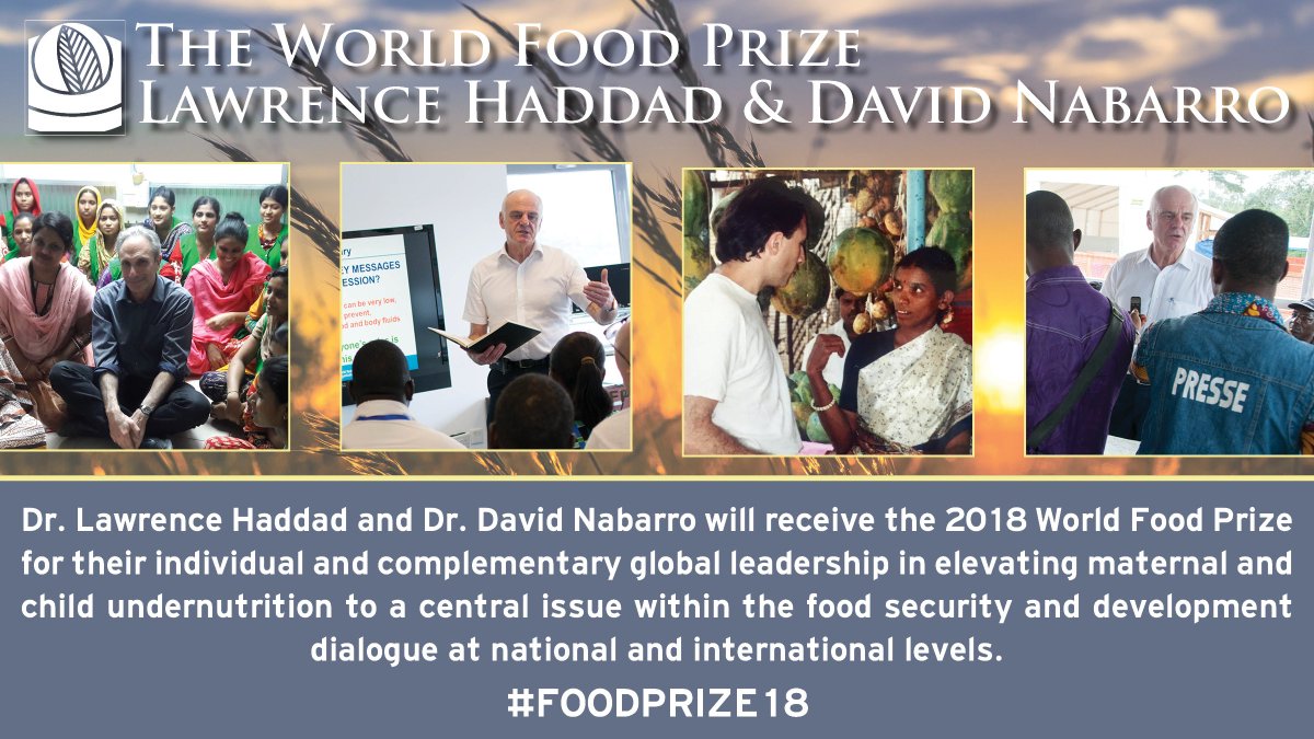 Huge shout out to two fantastically deserving individuals @l_haddad & @davidnabarro - just awarded the prestigious World Food Prize 2018, recognizing their deep commitment and visionary leadership. @newvisionforag @GAINalliance @FoodDialogues @wef