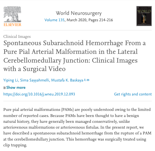 #Pial#Arterial#Malformation in the Lateral#Cerebellomedullary Junction:Clinical Images with a Surgical Video https://sciencedirect.com/science/article/pii/S1878875019331250?via%3Dihub ……@WorldNeurosurg@uw_neurosurgery@UWHealth@uwsmph@ElsevierConnect#ecase#opvid#nsgy#SAHpic.twitter.com/TbjYcLOeQS