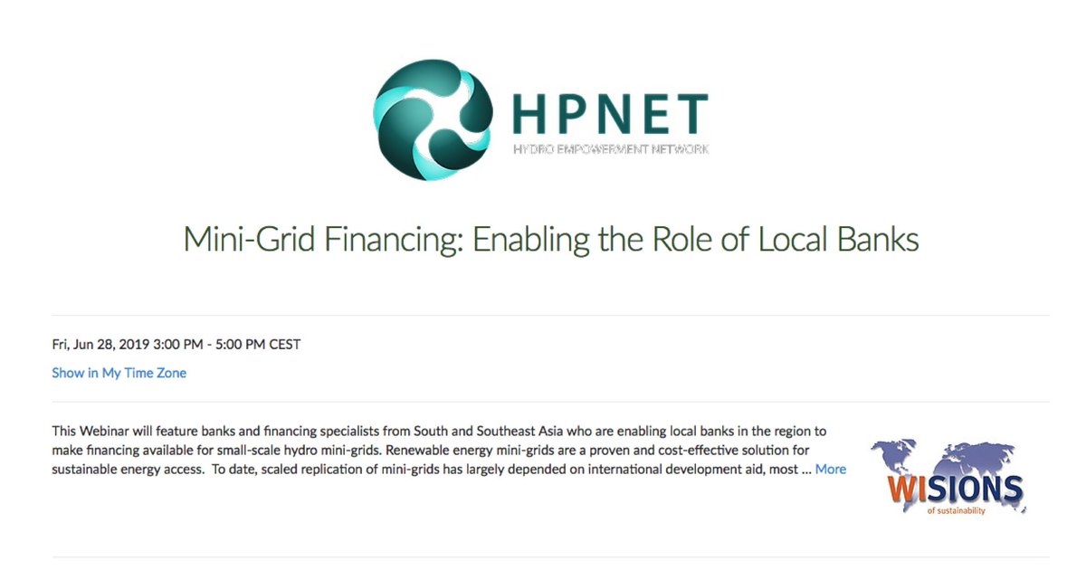 @HPNEThydro and@wisions on#MINIGRIDS#Energyfinancing on 28th June, 3:00 pm CEST, which will focus on the role of local banks. Please register here: https://register.gotowebinar.com/register/286958640442813452 … More information: http://www.hpnet.org/blog/join-us-june-28-webinar-on-mini-grid-financing …pic.twitter.com/pTXakbwg1J